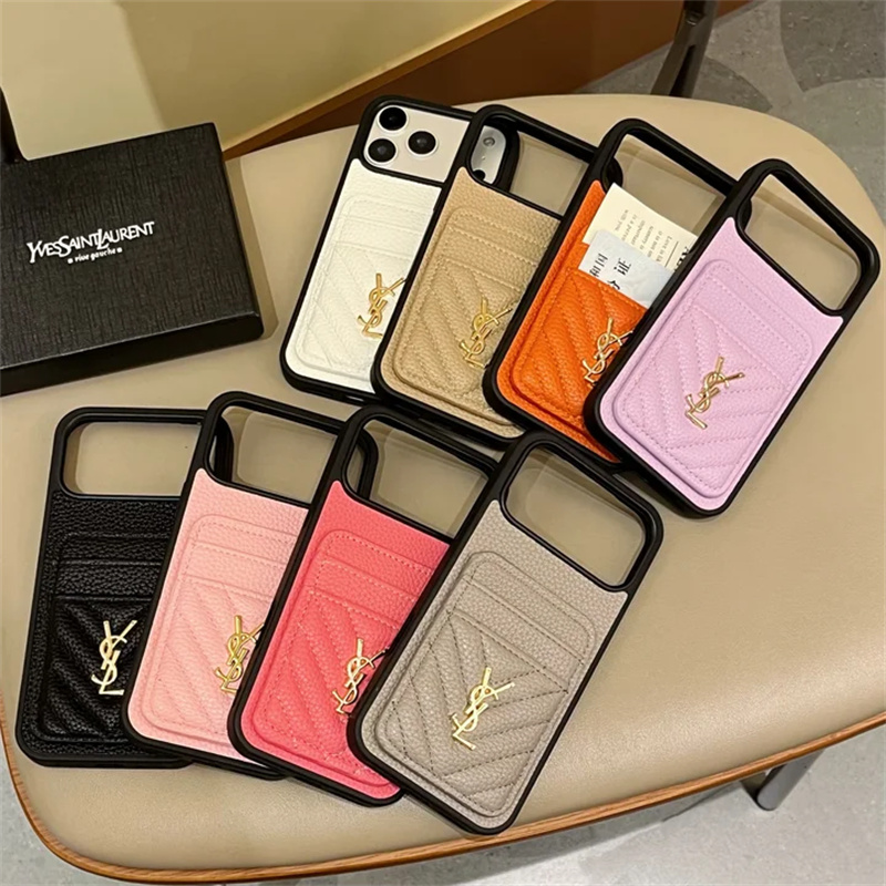 イブサンローランのキルティングレザー調iPhone17ケース。中央にはゴールドのYSLモノグラムが配置されており、一目でブランドのスタイルを感じさせるアクセントになっています。背面にカードを収納できるポケットが付いており、ICカードやクレジットカード、名刺などを1〜2枚入れて持ち運べるため、キャッシュレス派の方には非常に便利なデザインです。