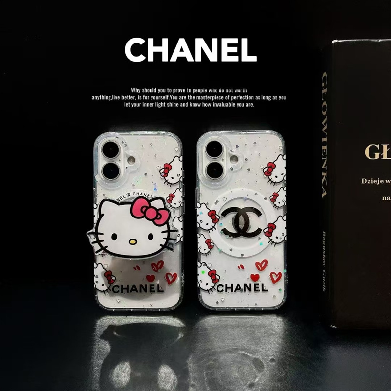 シャネル&キティちゃんコラボの可愛いiphone17magsafeケース!アイコニックなキティちゃん柄とブランド名が入っており、シャネル好きやキティちゃんファンたちに人気があるデザインです。取り外しできるキティちゃんモチーフのマグネットグリップは持ちやすく、動画を視聴する時にスタンドとしても便利です。