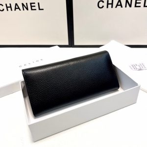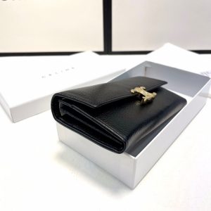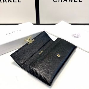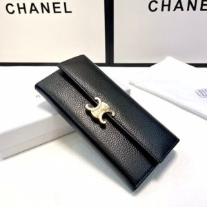 セリーヌ風の二つ折り長財布です。セリーヌのアイコニックなトリオンフが開閉部にあしらわれています。耐久性に優れる牛革の財布。シンプルで高級感を演出できます。内側には、カード入れ、お札入れ、ジッパーポケットが付いており、収納力もありおすすめのアイテムです。