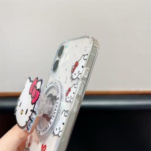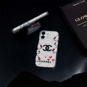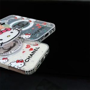 シャネル&キティちゃんコラボの可愛いiphone17magsafeケース!アイコニックなキティちゃん柄とブランド名が入っており、シャネル好きやキティちゃんファンたちに人気があるデザインです。取り外しできるキティちゃんモチーフのマグネットグリップは持ちやすく、動画を視聴する時にスタンドとしても便利です。