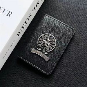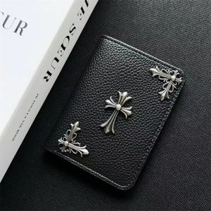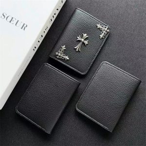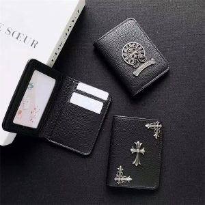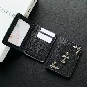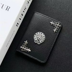 クロムハーツ(Chrome Hearts)の二つ折り財布。黒いレザー素材で、特徴的なシルバーハードウェア(クロスやロゴデザインなど)が施されており、ブランドの独特なデザイン性とアート感を表現しています。複数のポケットが配置されており、お札はもちろん、カードや免許証などの収納には十分に使えます!