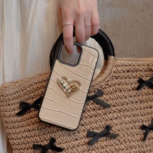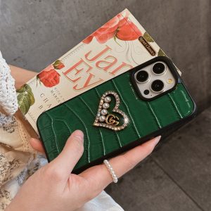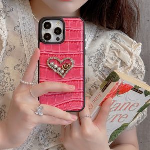グッチ風のレザー調iPhoneケースです。クロコダイル風の型押しを施し、キラキラなラインストーンがハートモチーフに仕上がられ、さらにパールで飾られて高級感が溢れます。またグッチのGG金具ロゴをあしらい、上品さが漂い、一瞬に目を引きます!