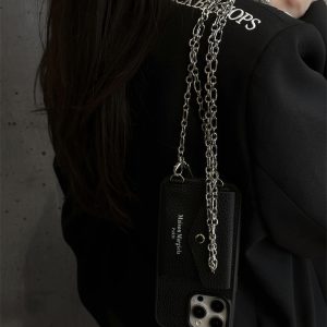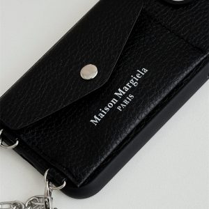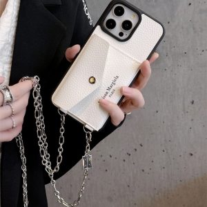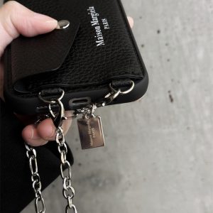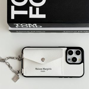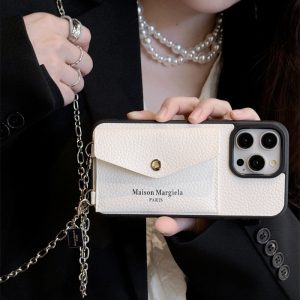 おしゃれなメゾンマルジェラ風ショルダーiPhone16ケース。ショルダーチェーン付きで斜めがけできてコーデのアクセサリー感覚でも使えます。背面にカードポケットも配置されており、日常用のカードなどを収納可能でちょっとしたお出掛けにこの一品で十分!