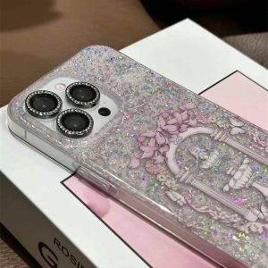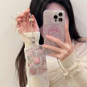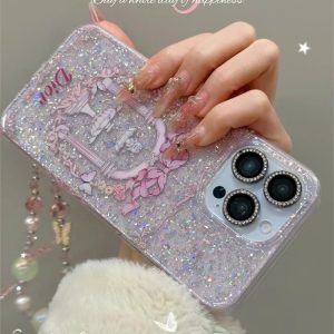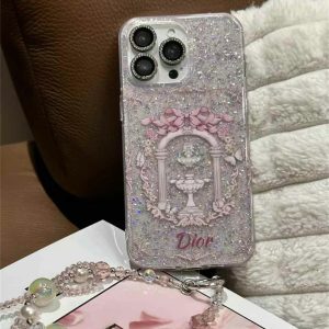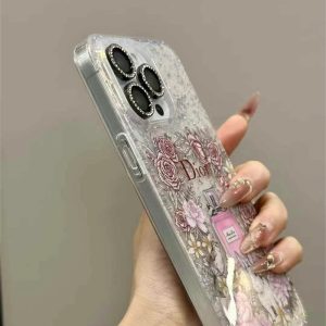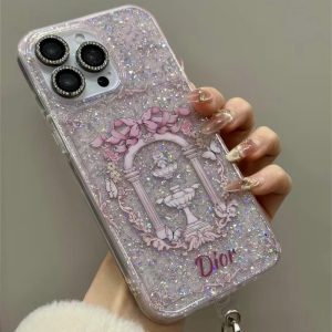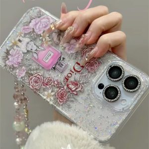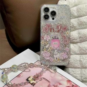 ディオール風のiphone16/15ケース。透明な素材にラメグリッターが入っており、煌びやかなデザインになっています。ディオールの香水柄や蝶々柄、花柄などが施されており、ピンク調のデザインは可愛く見えます。落下防止のビーズストラップも付き!ラグジュアリースタイルを追い求める若い女子の方々にぜひお見逃しなし!