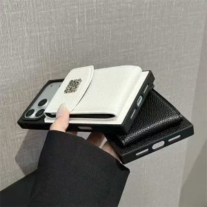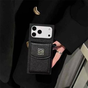 ロエベ風スクエア型のiPhone17/16ケースです。ブランドのアナグラム金具をあしらい、上品でスタイリッシュなデザインに仕上げました。背面にアコーディオン式カードポケットを搭載しており、カードや名刺などを複数収納可能。白と黒の2色展開で、カップル用にも最適!
