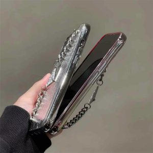 アルミニウム風のプラダiphone16ケース。光を反射して華やかな印象を与えます。特徴的なのは、ケースについたシルバーのチェーンと、チェーンに取り付けられたプラダのトライアングルロゴで、これらの要素が組み合わさり、ケースに高級感とファッション感をもたらしています。