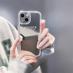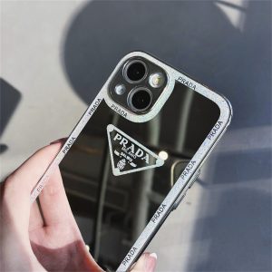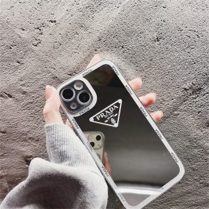 プラダ風アイフォン16シリーズケース。背面はミラーデザインで、ちょっとしたメイク直しに役立つ!プラダのトライアングルロゴがプリントされ、スタイリッシュで高級感が溢れます。