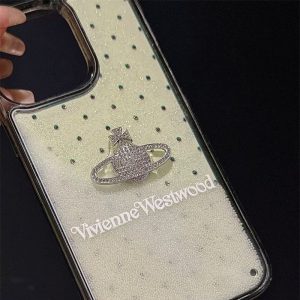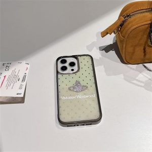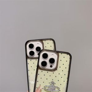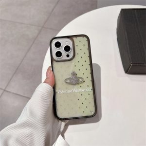 乙女心をくすぐるヴィヴィアン風のiPhone16/15ケース。クリームイエローのケースにドット柄が可愛い!ラインストーンで飾られたヴィヴィアンのオーブマークをあしらい、ブランドロゴもプリントされ、ラグジュアリーな感じがアップ!またケースの中にミニビーズとグリッターが入り、手の動きによりキラキラして流れる!遊び心と実用性を兼ね備えたiPhoneケースです!