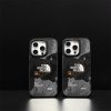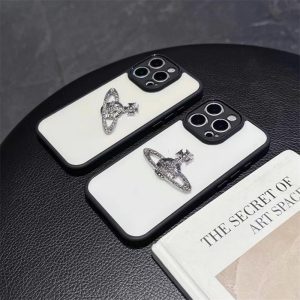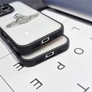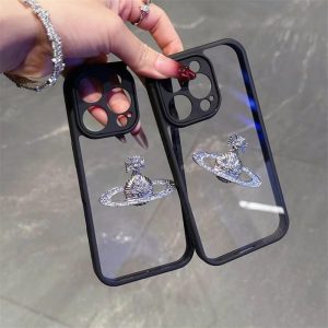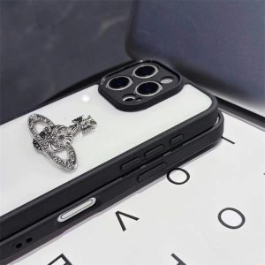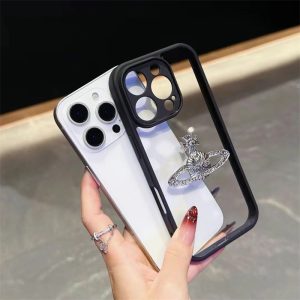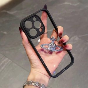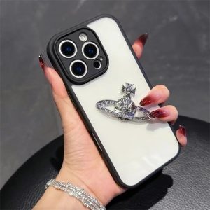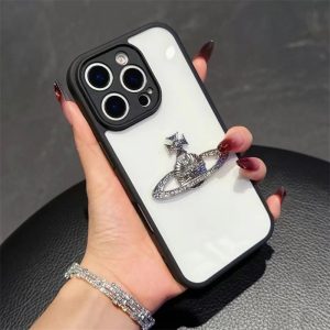 ヴィヴィアン風のクリアiPhone16ケース。透明なケース本体に黒いエッジ、そして中央にヴィヴィアンを代表する惑星ロゴが飾られています。クリスタルやラインストーンのような飾りで仕上げられており、華やかで高級感のある外観を呈し、大人レディースに愛用されています。